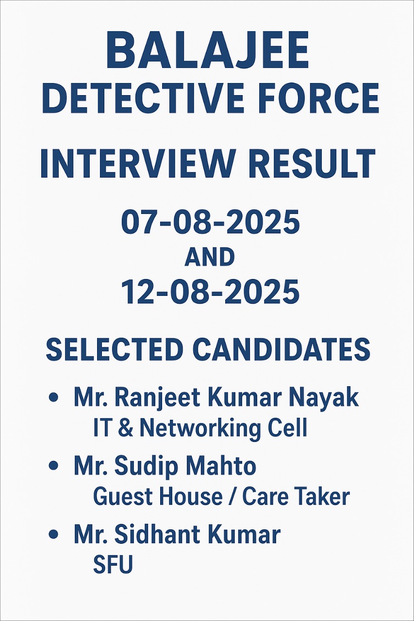 Note: Shortlisted Candidate are advised to report to Admin Block, Administration Building, NIAMT, Hatia, Ranchi as per date and time mentioned. Note: Date has been rescheduled from 30.04.2025 to 01.05.2025 for test/exam/interview for post of Security Supervisor (general) and Supervisor (office) for Advt. No:- BJDF/ NIAMT/01 and timing will remain same. Note:- Due to administrative reason the interview for the post of Technical Supervisor (System Administration) and Technical Supervisor (Network Administration) has been rescheduled from 6/05/2025 to 07/05/2025. Everything else will remain the same. Please notify on your website. |